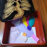 子どもたちが作った折り紙と共に重箱に託しました♪