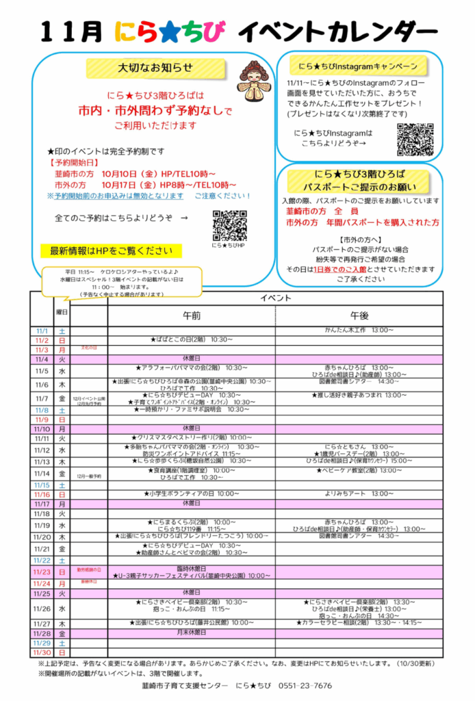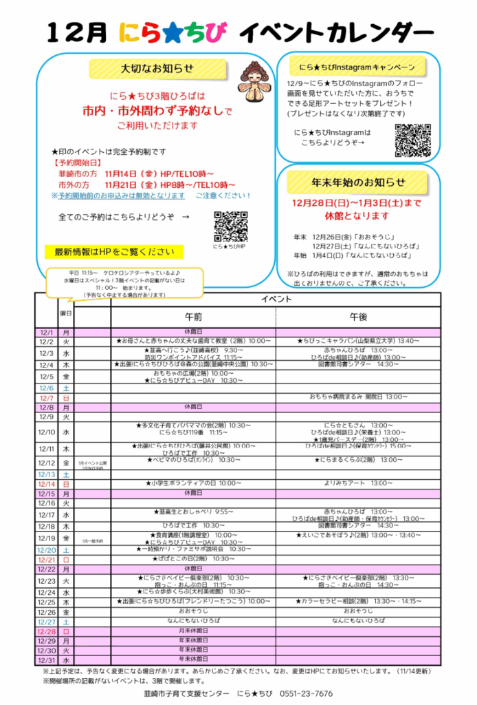 ※キャンセルの場合は、必ず電話(0551-23-7676)またはメール(kosodate@mail.nirachibi.jp)でご連絡ください。