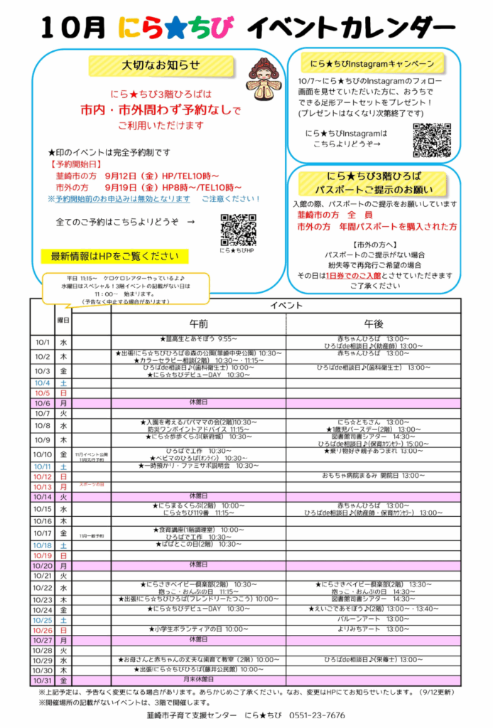 ※キャンセルの場合は、必ず電話(0551-23-7676)またはメール(kosodate@mail.nirachibi.jp)でご連絡ください。